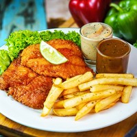 Dory Fish coated with Crispy Batter x Nemo Sauce x Black Pepper Sauce x Fries