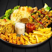 Chicken Grill x Lamb Grill x Chicken Parmigiana x (Spaghetti Bolognese beef) x Fries x Cheezy Wedges x Homemade Meatball 4 pcs (beef) x Black Pepper Sauce x Creamy Mushroom Sauce (3-4 pax)